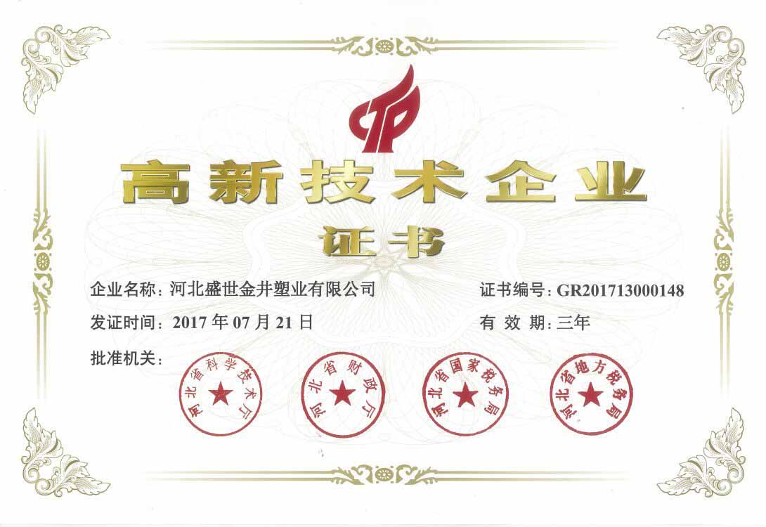 高新技術(shù)企業(yè)申請(qǐng)成功,標(biāo)志著盛世金井作為中國(guó)塑料檢查井新一代研發(fā)者,其企業(yè)技術(shù)創(chuàng)新水平邁上了新臺(tái)階,同時(shí)也奠定了盛世金井在塑料檢查井行業(yè)技術(shù)創(chuàng)新的地位。