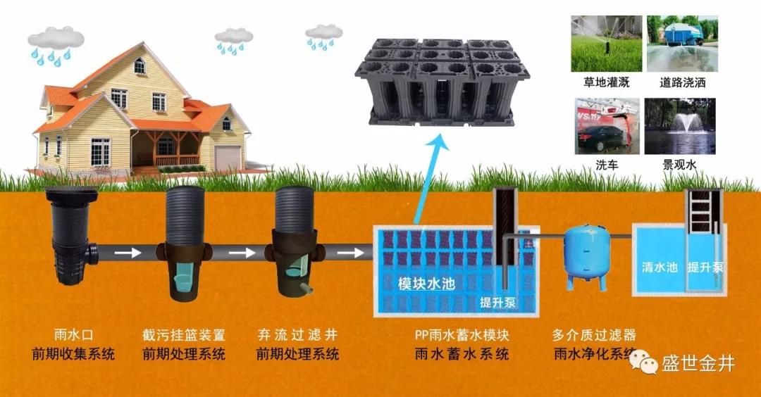 雨水落到地面后,經(jīng)過初期的截污、棄流處理,截留雨水中較大懸浮物與漂浮物,水匯集并儲存到模塊蓄水池,再經(jīng)過自然沉淀使雨水中的懸浮物質(zhì)(主要是可沉固體)在重力作用下沉淀,從而雨水分離,并經(jīng)過對收集的雨水進(jìn)行處理后達(dá)到符合設(shè)計(jì)使用標(biāo)準(zhǔn)的系統(tǒng)。