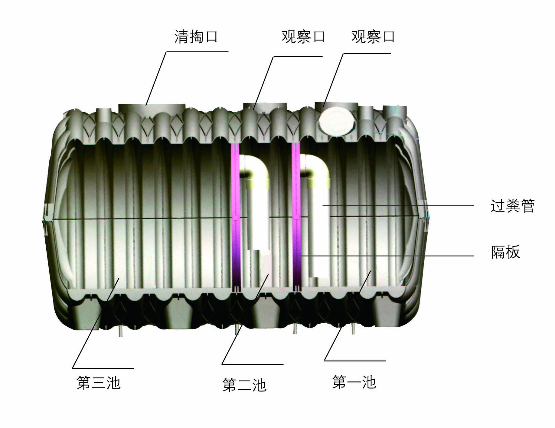 塑料“三格式”化糞池是處理糞便并加以過濾沉淀的設備,是一種環保型化糞池。其原理是固化物在池底分解,上層的水化物體,進入管道流走,防止了管道堵塞,給固化物體(糞便等垃圾)有充足的時間水解。 化糞池指的是將生活污水分格沉淀,及對污泥進行厭氧消化的小型處理構筑物。
